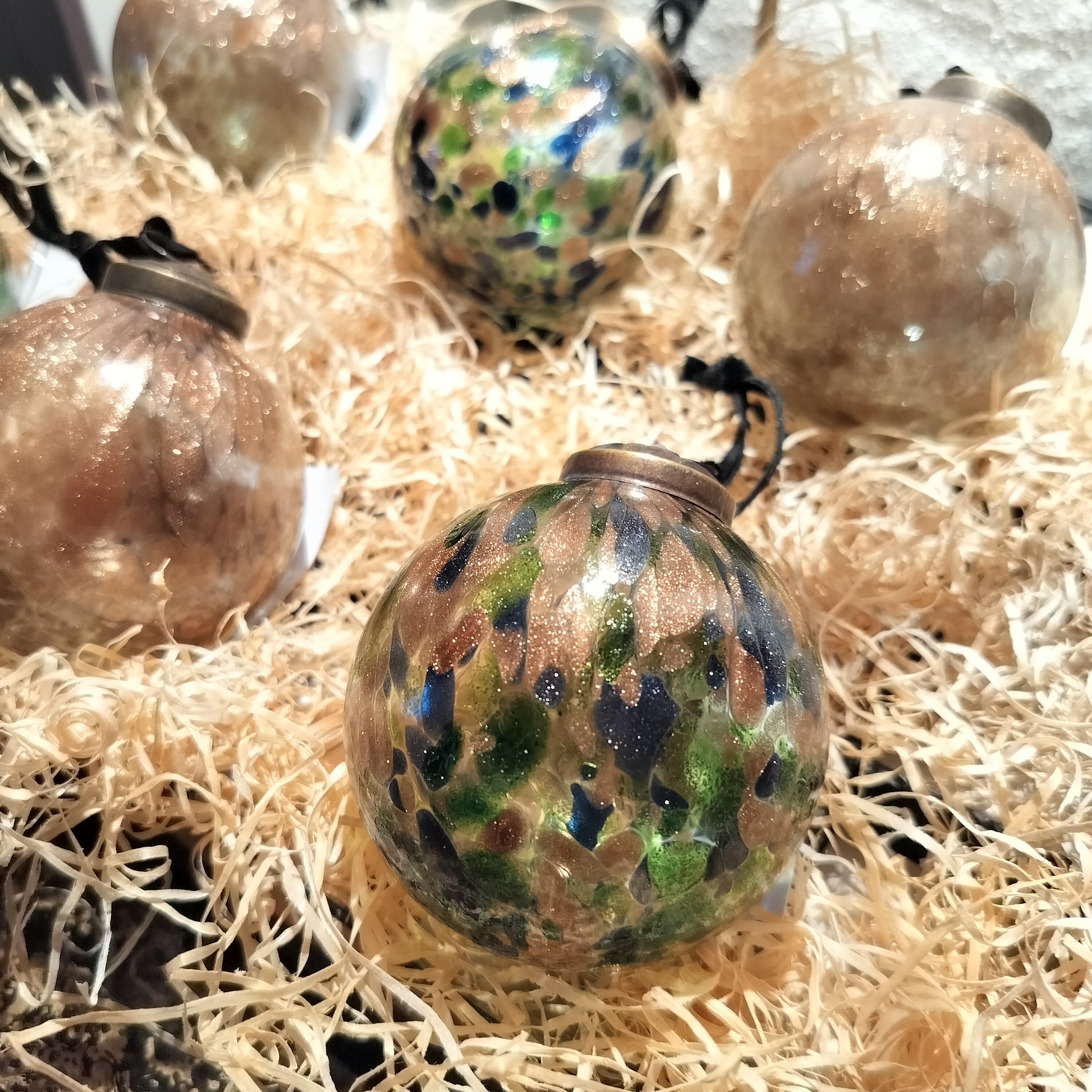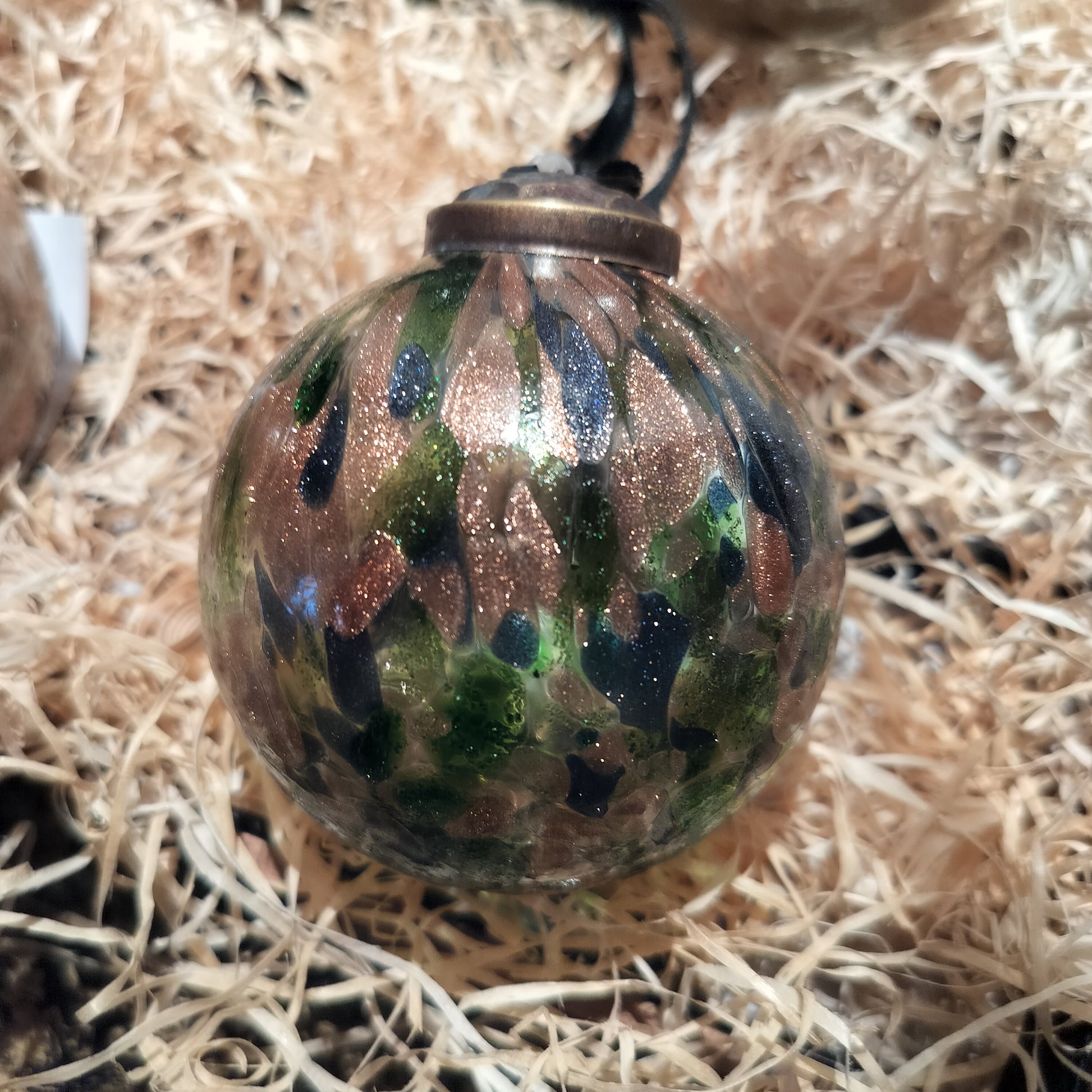 Skab en magisk og elegant julestemning med denne håndlavede Aurora glaskugle, rullet i et glimtende miks af grønne, blå og bronze glasskår.