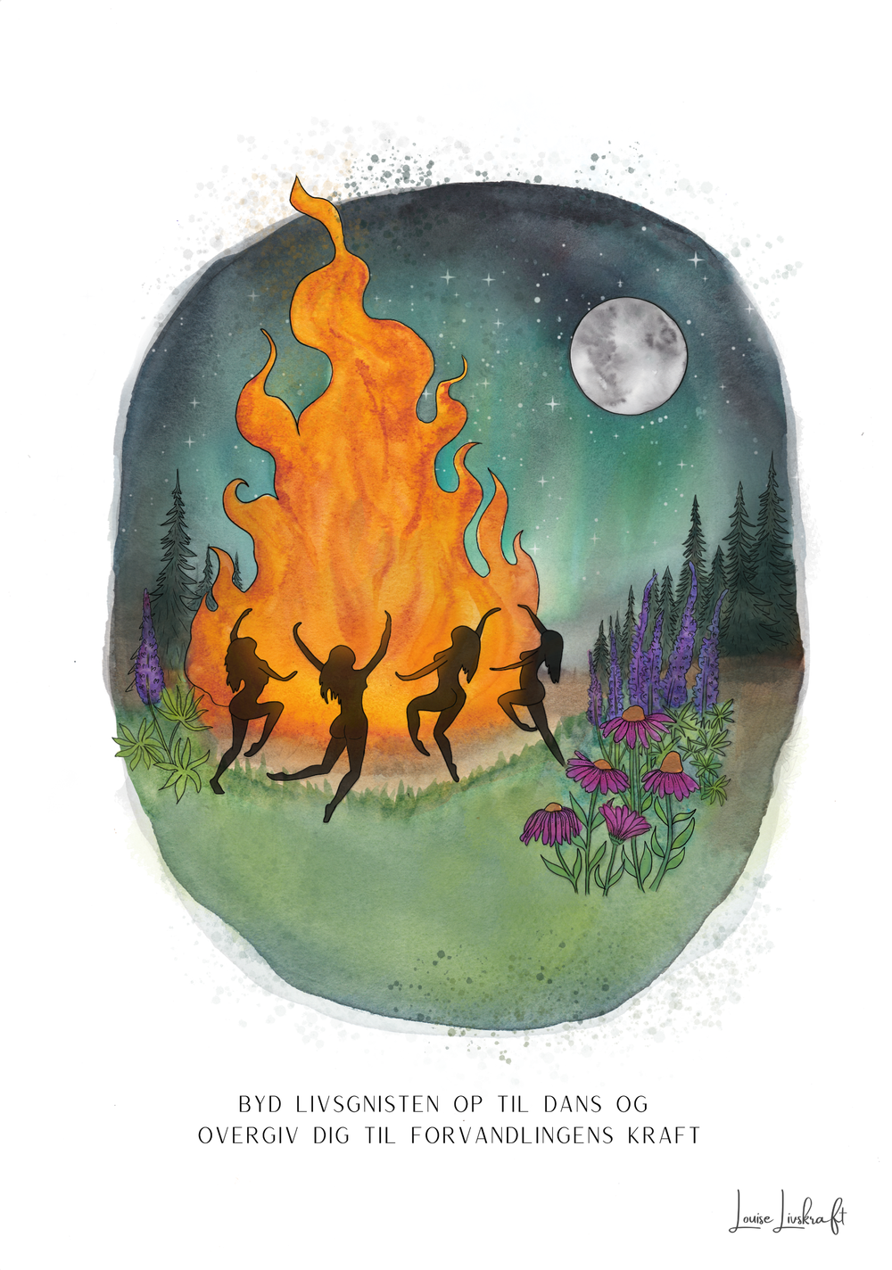 Illustrationen er skabt til årsbogen Din Feminine Visdom, skrevet af Stine Schou Kvistgaard. Louise Livskraft har elsket hvert minut af det kreative samarbejde med denne indsigtfulde sjæl og kan varmt anbefale at læse årsbogen. I bogen bliver du kærligt guidet gennem årets skiftende faser og dine egne udsving. På poetisk og praktisk vis inspireres du til at læne dig mere ind i naturens cyklusser, for at få glæde af de vidt forskellige gaver, der gemmer sig i de forskellige faser.