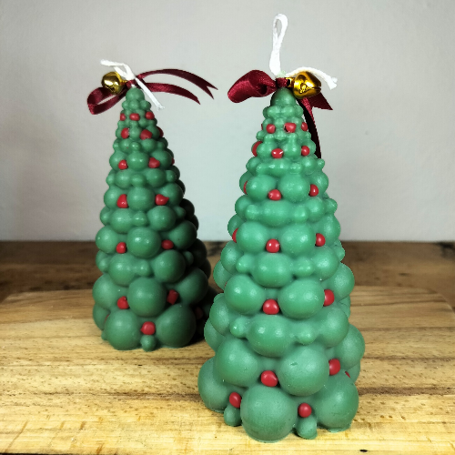 Skab hyggelig julestemning med disse smukke Juletræs Lys – håndlavede i en elegant kegleform, der minder om et klassisk juletræ. Lysene grønne bobbel lys med røde kugler. Som et almindeligt pyntet juletræ.