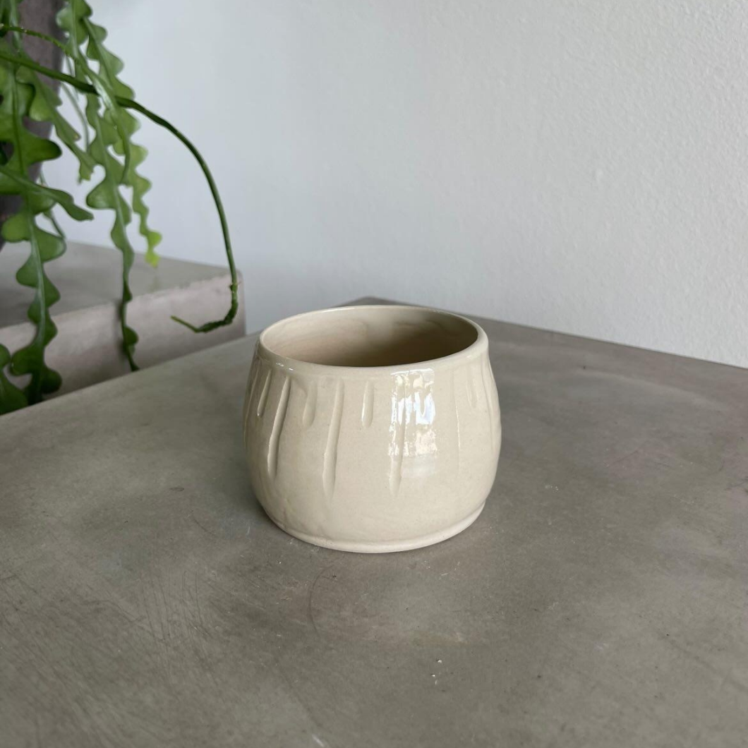 En charmerende lille krukke, håndlavet i nordisk stil, med en diameter på ca. 7,5 cm og en højde på ca. 5,5 cm. Øverst prydes krukken af et smukt mønster, hvor korte og lange streger skaber et levende, grafisk spil – en lille detalje, der gør hver krukke unik.