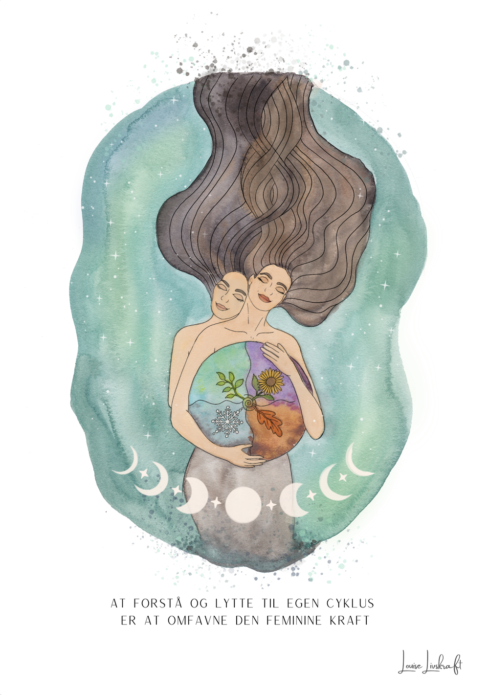 Denne akavarelplakat inviterer dig til at omfavne din feminine kraft ved at lytte til og forstå din egen cyklus. Illustrationen viser to kvinder i en kærlig omfavnelse, hvor de sammen holder en cirkel, der repræsenterer årstidernes skiften og de cykliske elementer – fra forår til vinter, fra vækst til hvile.