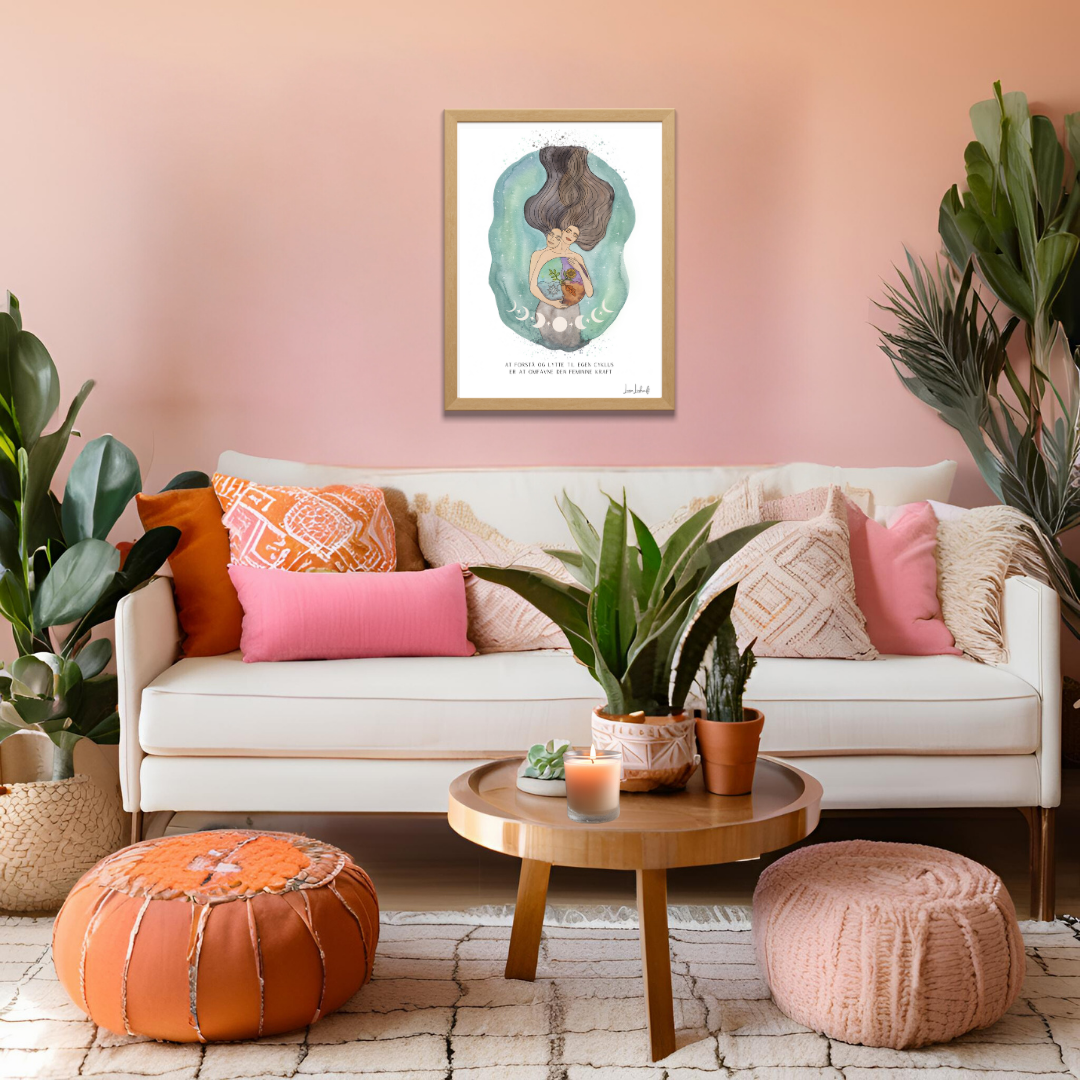 Denne plakat er til kvinder, der ønsker at styrke forbindelsen til deres egen indre verden, eller som arbejder med cyklisk bevidsthed og femininitet. Den er perfekt som en daglig påmindelse i hjemmet, yogastudiet eller terapi-/coachingrummet.