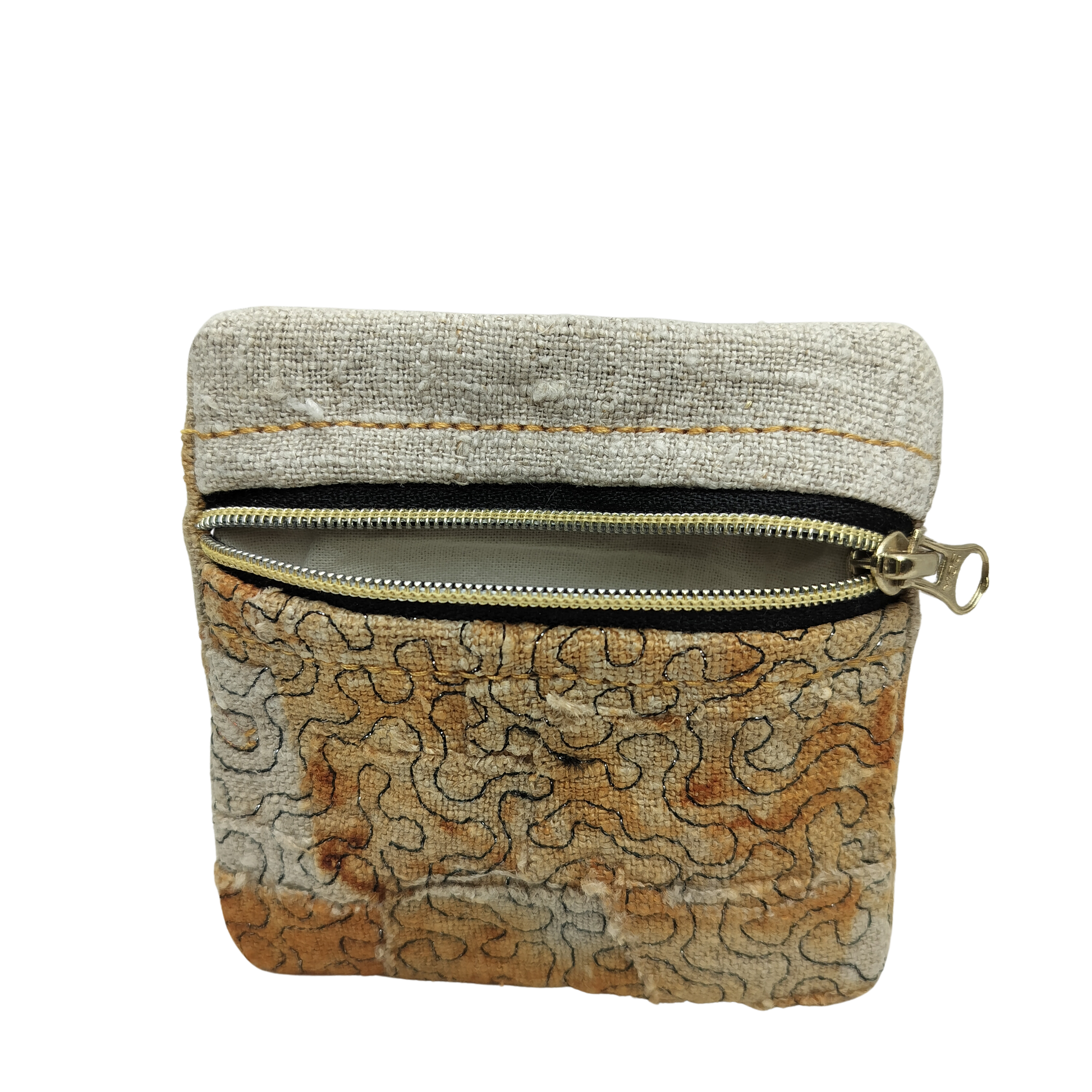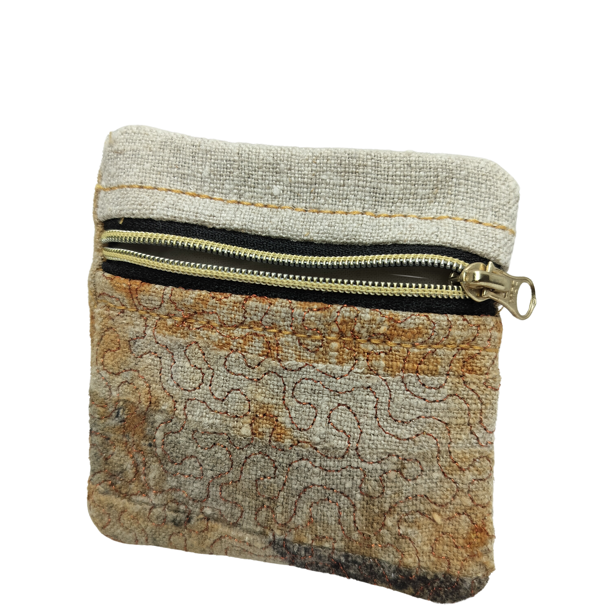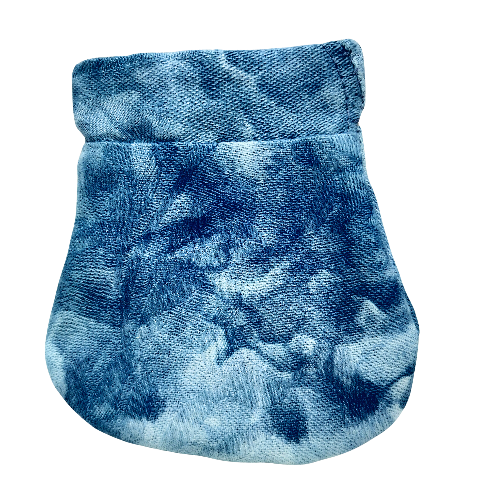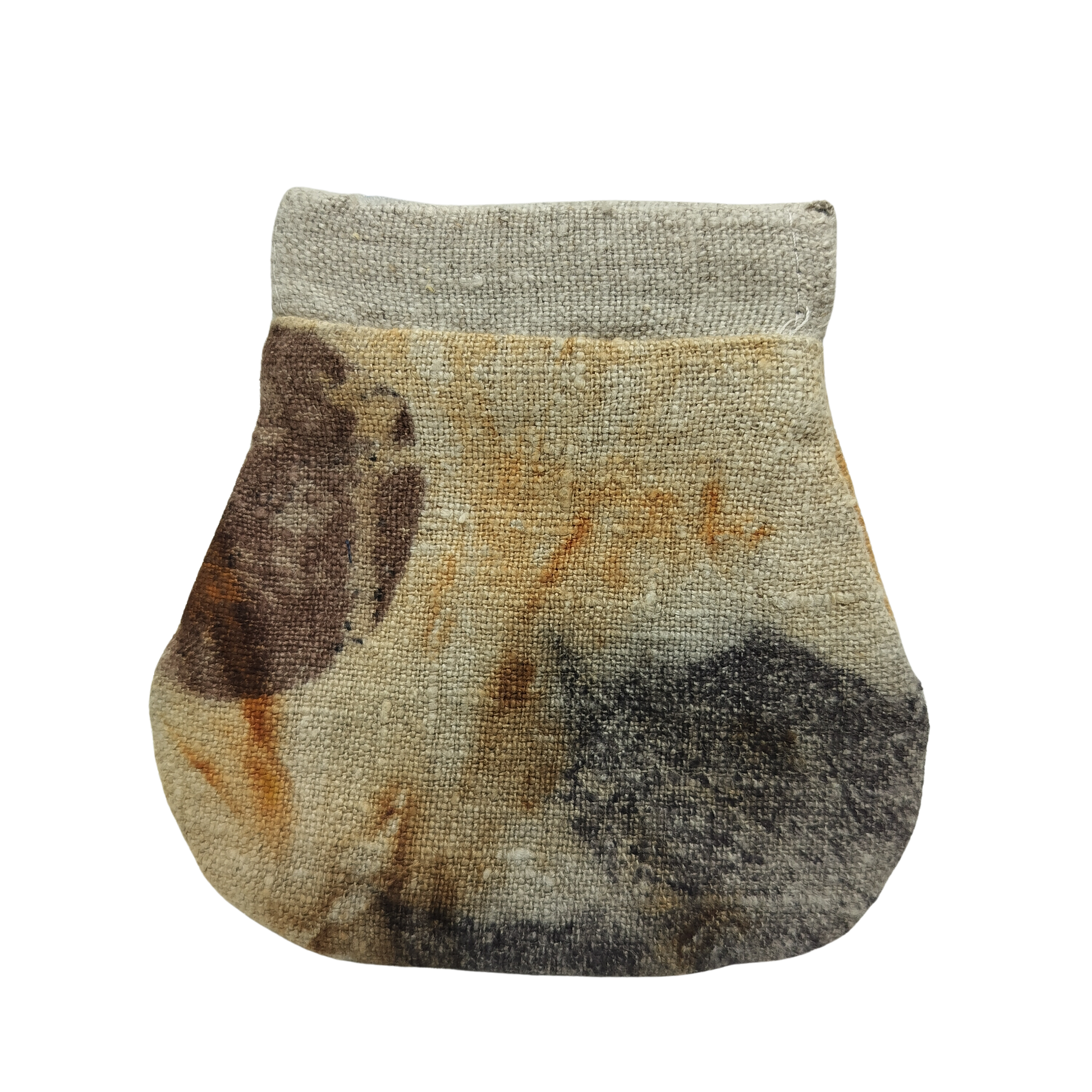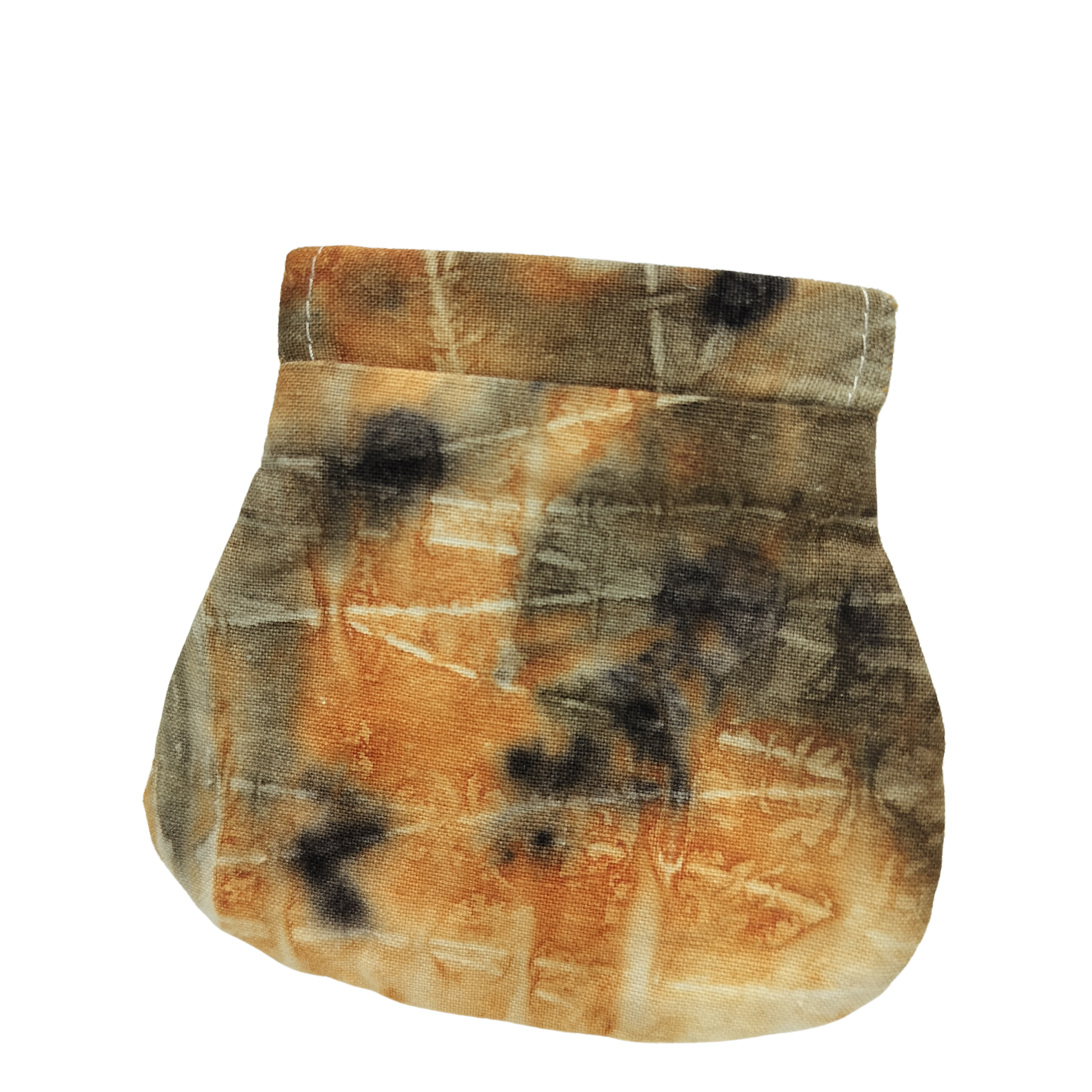 Denne lille pung er et stilfuldt og praktisk valg, der kombinerer funktionalitet og bæredygtighed. Den er syet i genanvendt stof og håndfarvet med isfarvningsteknik samt eco print, hvilket giver hver pung et unikt og naturligt udtryk.
