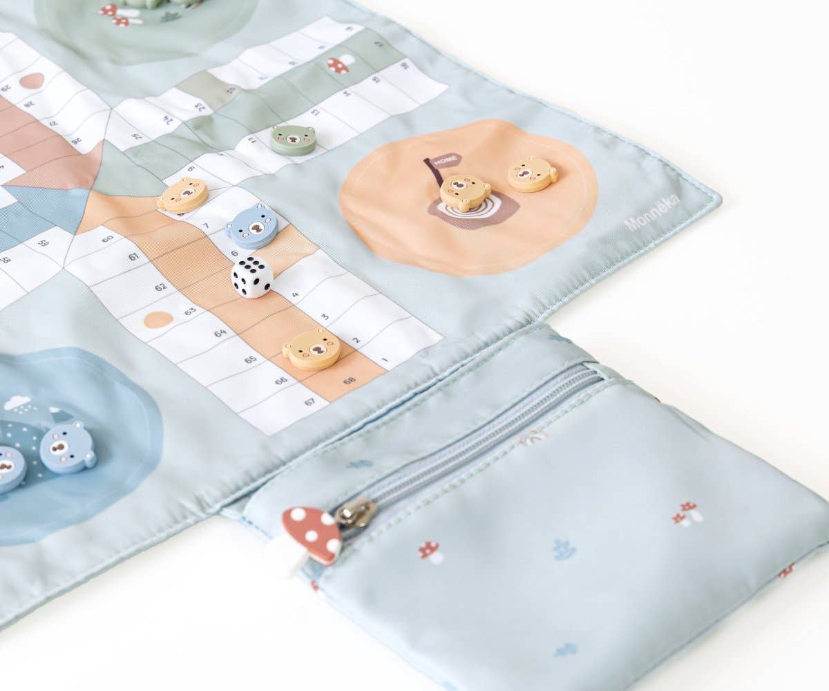 Tag det klassiske Ludo-spil med dig overalt – til stranden, sommerhuset, skovturen eller storbyferien. Dette rejsevenlige Ludo fra Monnëka kommer med et blødt stofbræt, der foldes nemt sammen og opbevares i en lille lomme med lynlås – helt perfekt til tasken.