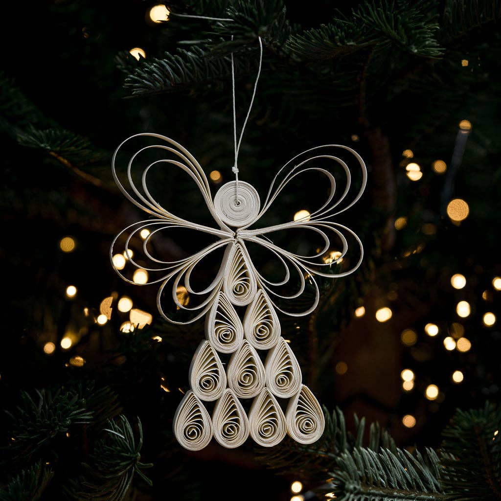 Denne smukke engel i papir er skabt med den gamle kunstform quilling, hvor tynde strimler af papir rulles og formes til fine detaljer.