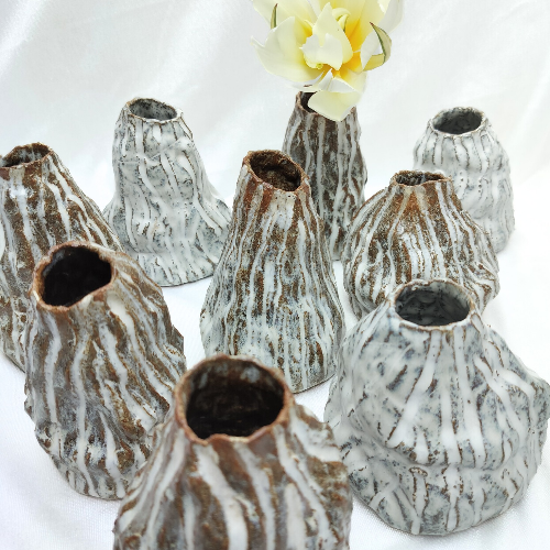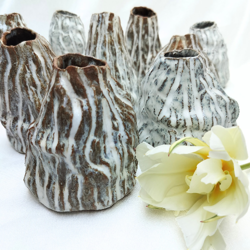 Opdag en kollektion af håndmodelerede små vaser – hver eneste en unik skulptur, skabt i grov stentøjsler med masser af karakter og sjæl. Vaserne er nænsomt begittet og glaseret, hvilket giver dem et smukt, blankt udtryk, hvor det rå og det elegante mødes i perfekt harmoni. ✨