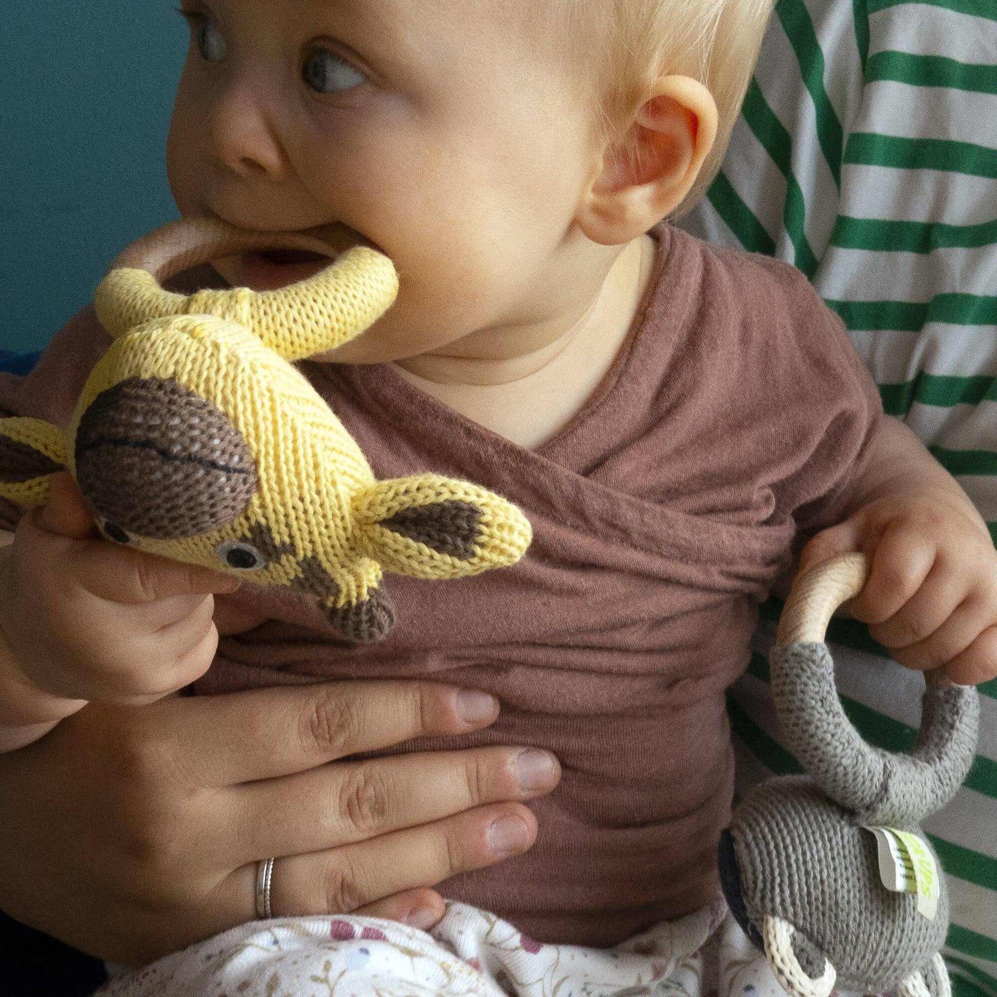 Når babyens gummer klør, og tænderne presser på, kan en tryg lille ven gøre hele forskellen. Denne håndlavede bidering fra HiCKUps har en sød giraf, der både vækker smil og lindrer gummerne på naturlig vis.
