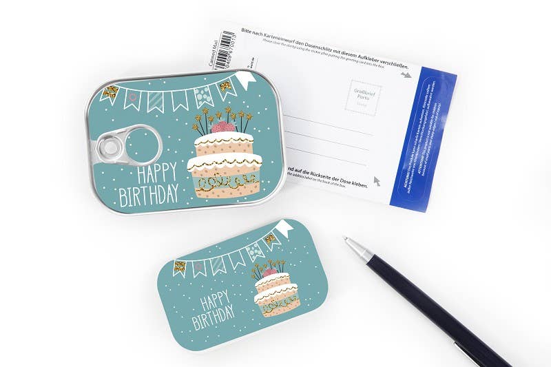 Denne smukke dåse i blå med fødselsdagskage og teksten “Happe Birthday” er den perfekte indpakning til pengegaver, gavekort, små billetter eller en sød personlig hilsen.