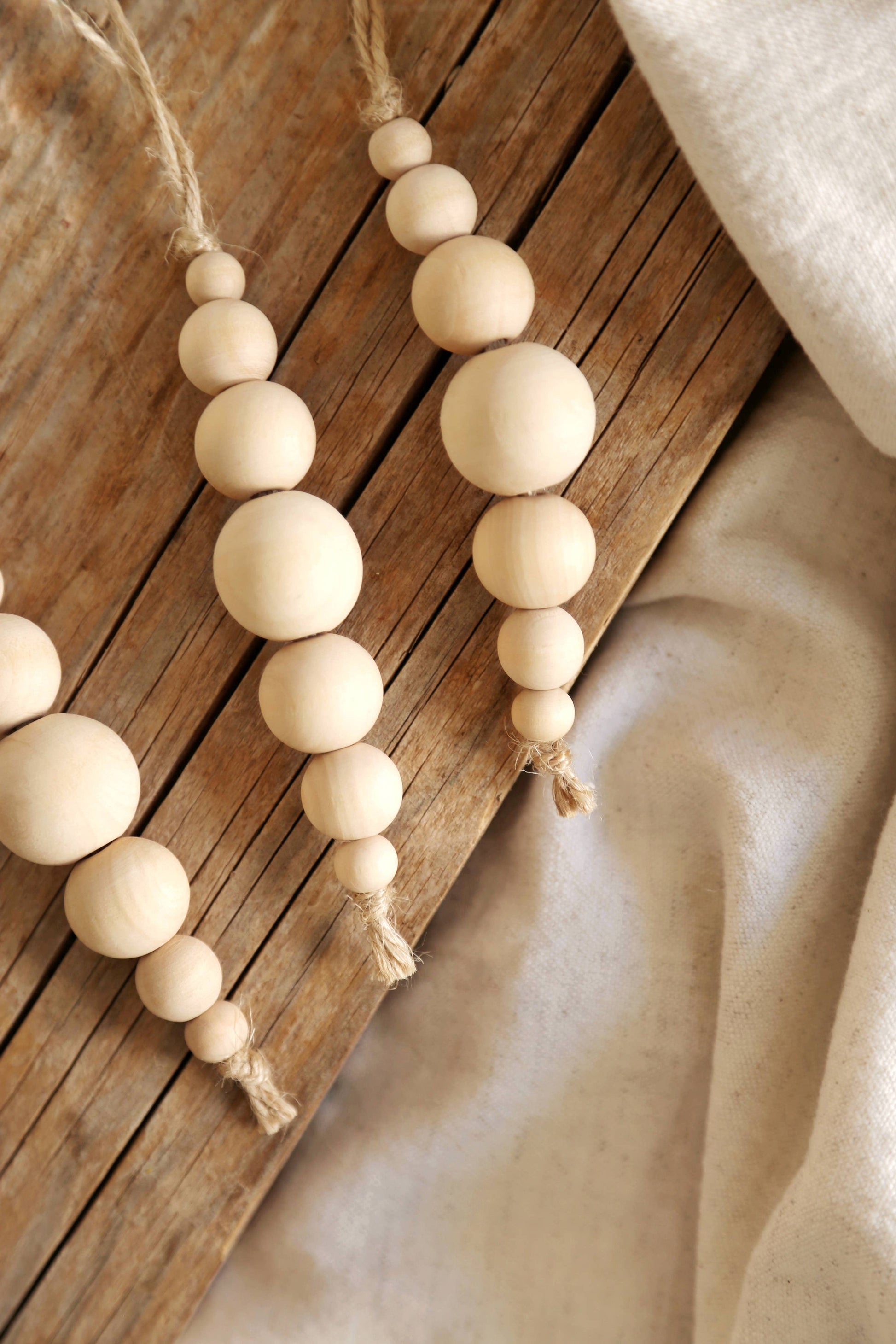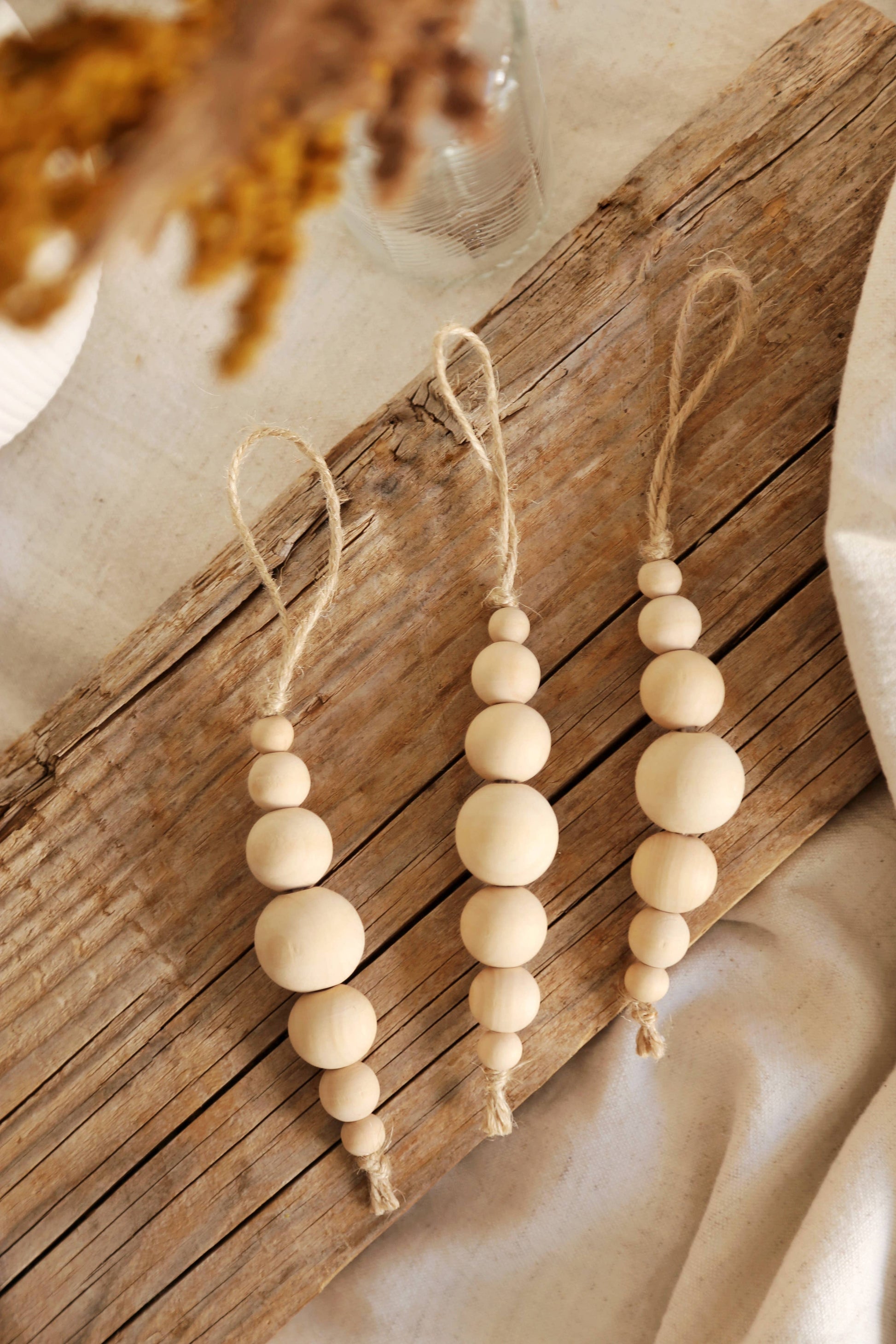 Hver dekoration består af ubehandlede træperler i forskellige størrelser, samlet på en jutesnor – et smukt valg til dig, der elsker skandinavisk minimalisme og bæredygtigt design.